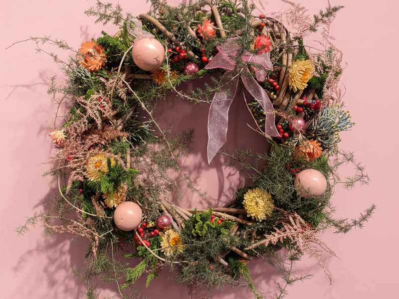 Een natuurlijke, luchtige krans opgebouwd op een rotan basis, rijk gevuld met zacht groen, perzikbloemen, subtiele bessen en pastelroze kerstballen. De speelse takjes en het transparante lint geven een warme, rustieke decemberstijl.