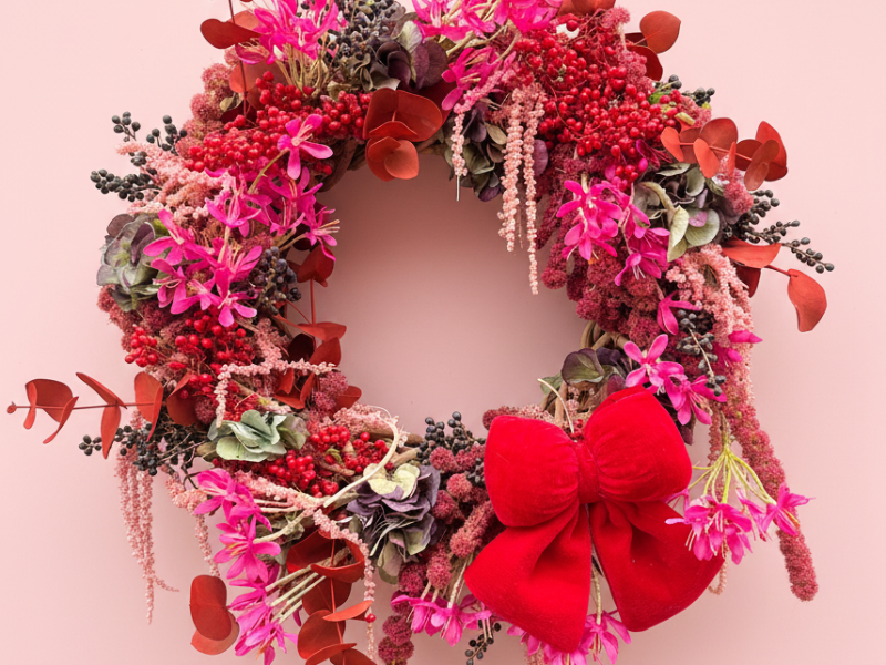 Een volle, weelderige krans op een rotan basis, prachtig aangekleed met fuchsia bloemen, rode bessen, hortensia-accenten en speels hangend drooggroen. De fluweelrode strik maakt haar extra feestelijk en warm.