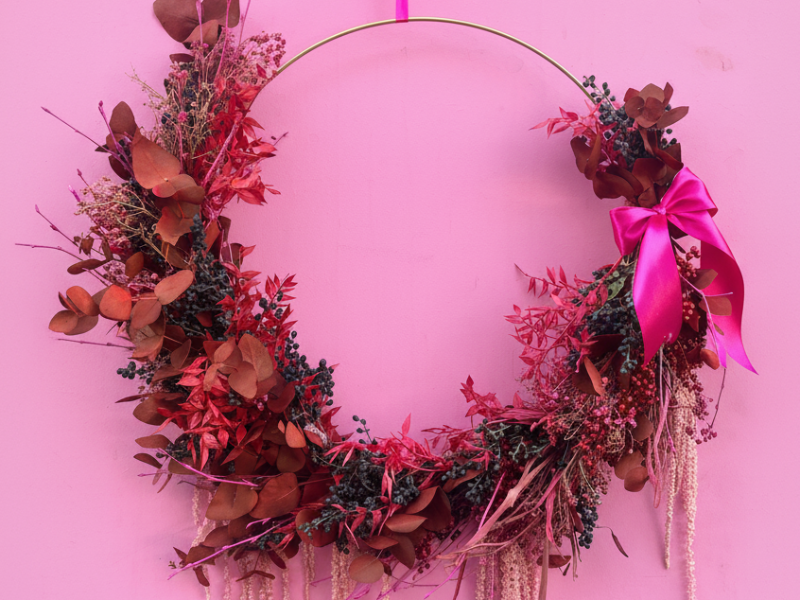 Een moderne, stoere krans vol warme rood- en rozetinten, gecombineerd met bessen en speels hangend drooggroen. De gouden ring geeft een chique touch, terwijl de kleurmix zorgt voor een opvallend, trendy accent.
